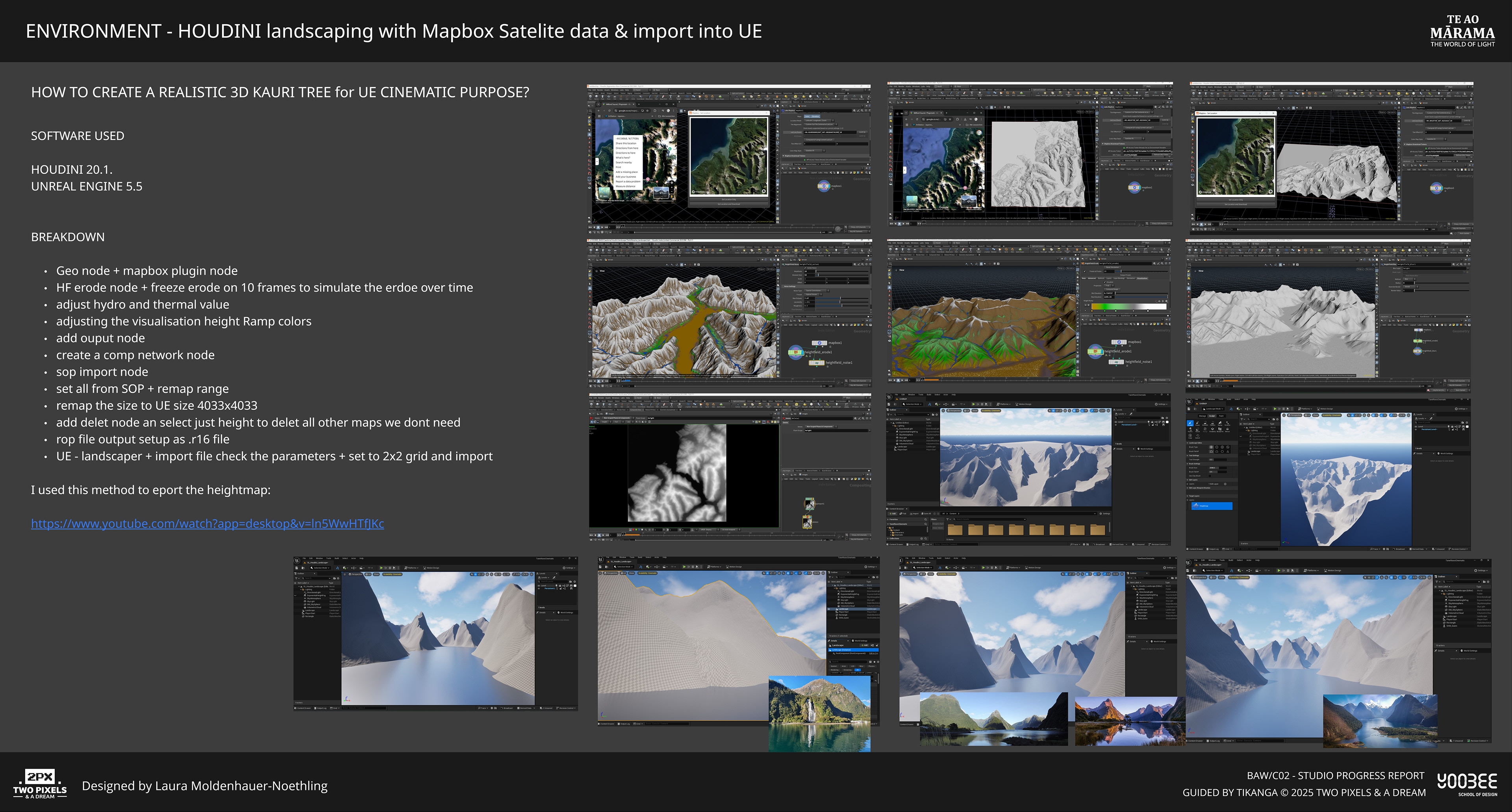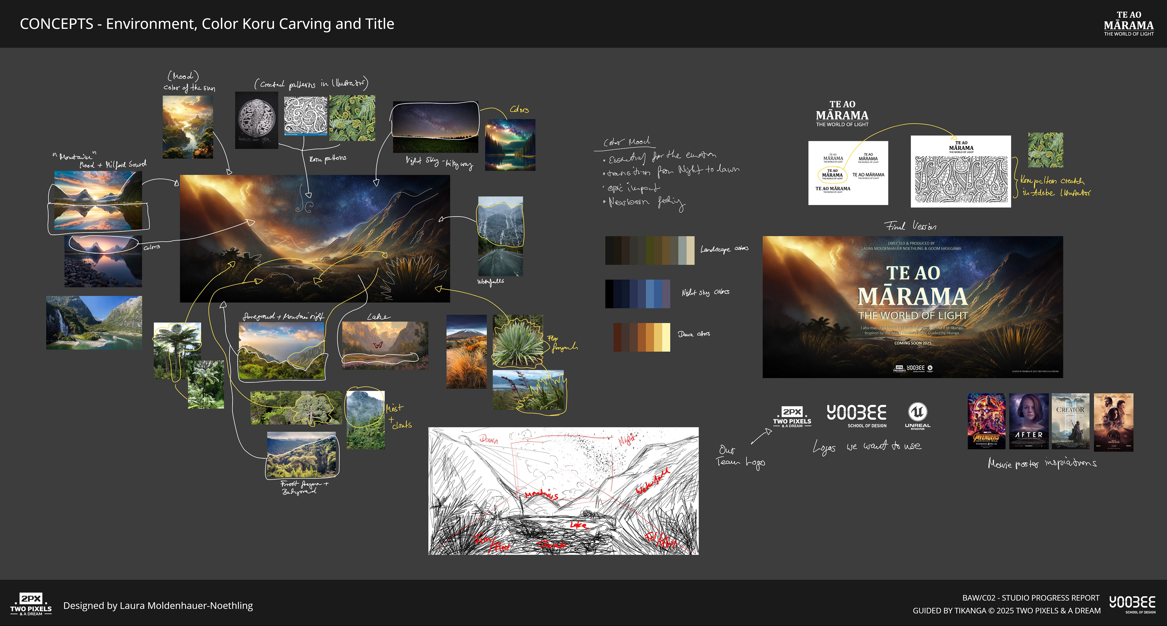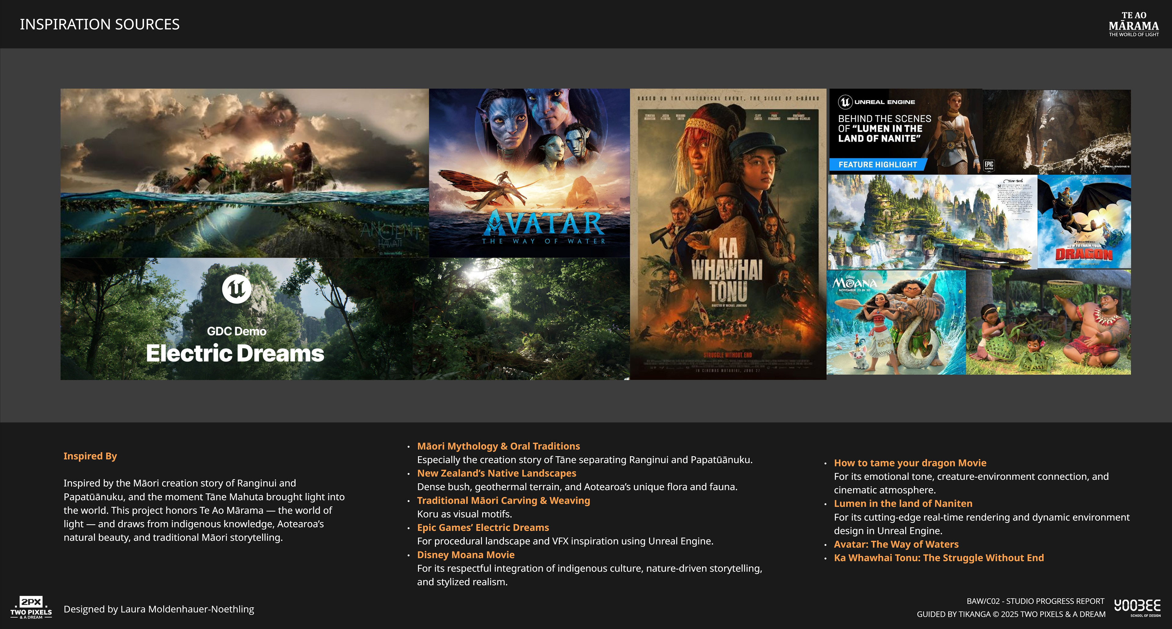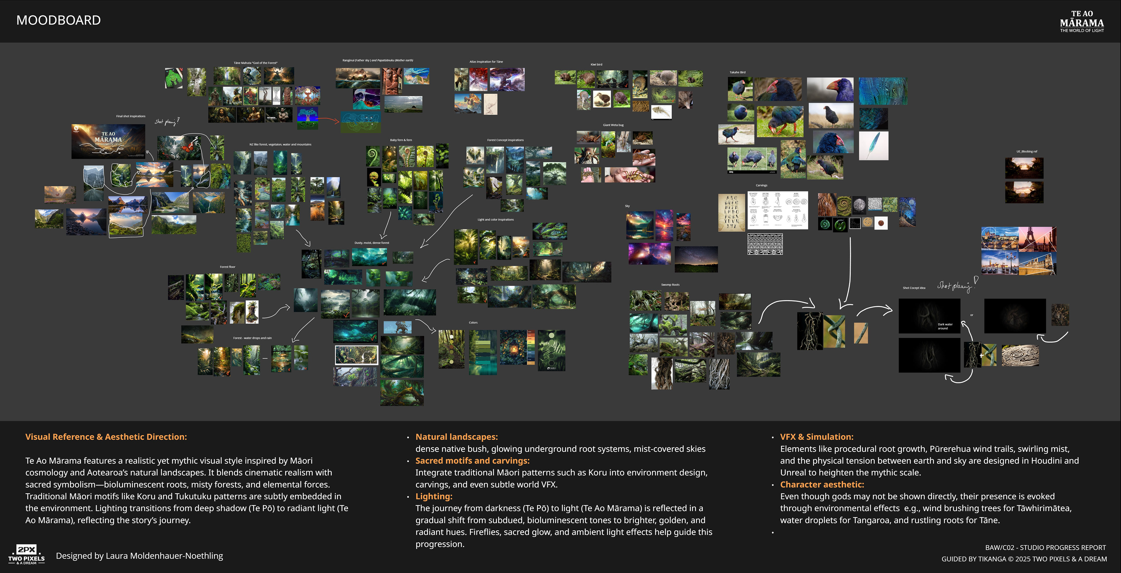 Te Ao Mārama (The World of Light) is a visually immersive 3-minute 3D short film/documentary about the Māori creation story. The story is focusing on the moment when Tāne Mahuta (the god of the forest and birds) separates Ranginui (Sky Father) and Papatūānuku (Mother Earth) to bring the first light into the world. The film blends cinematic storytelling and real-time world-building workflows in Unreal Engine with indigenous mythology, set in a realistic, procedurally created New Zealand environment. As individuals with non-New Zealand origins with a deep love for Aotearoa, we are telling this story to learn and grow alongside Te Ao Māori (Māori worldview). The film is guided by Tikanga (Māori ethics framework) and Māori cultural advisors for the Tangata Whenua (People of the land) to ensure an ethical and accurate retelling and representation.